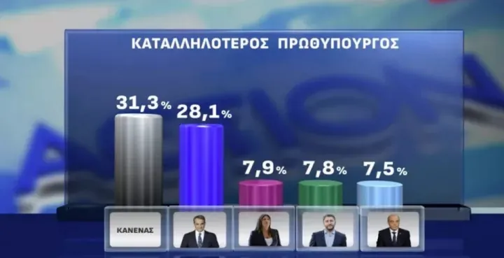 Στην ερώτηση για καταλληλότητα για Πρωθυπουργός ο «κανένας» εμφανίζεται στο 31.3%. Από εκεί και πέρα πρώτος εμφανίζεται ο Κ. Μητσοτάκης με 28.1% και ακολουθούν η Ζωή Κωνσταντοπούλου με 7.9%, Νίκος Ανδρουλάκης με 7.8%, ο Κ. Βελόπουλος με 7.5%, η Α. Λατινοπούλου και ο Δ. Κουτσούμας με 2%, ο Σ. Φάμελλος με 1.8%, ο Σ. Κασσελάκης με 1.7%.