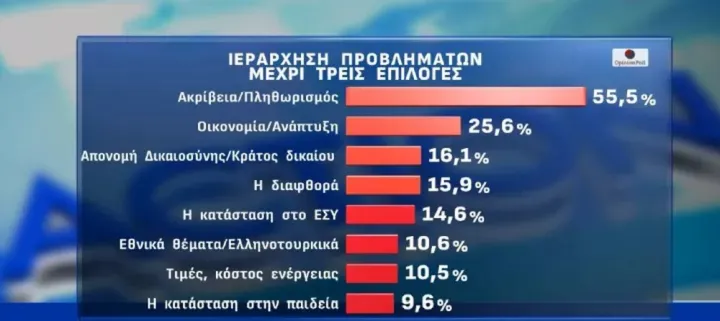 Στα προβλήματα που ιεραρχούν ως πιο σημαντικά οι πολίτες μακράν πρώτη βρίσκεται η ακρίβεια με 55,5%. Ακολουθούν η Οικονομία/ Ανάπτυξη με 25,6%, η απονομή Δικαιοσύνης / Κράτους Δικαίου και η Διαφθορά που αυξάνουν τα ποσοστά τους στο 16,1% και 15,9% αντίστοιχα, η κατάσταση στο ΕΣΥ με 14,6% σε πτωτική πορεία, τα Εθνικά θέματα/ Ελληνοτουρκικά με 10,6%, το κόστος ενέργειας με 10,5%, η κατάσταση στην Παιδεία με 9,6% κ.λ.π.