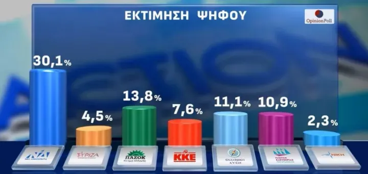 Στις 13,2 μονάδες η διαφορά ΝΔ - ΠΑΣΟΚ στην πρόθεση ψήφου