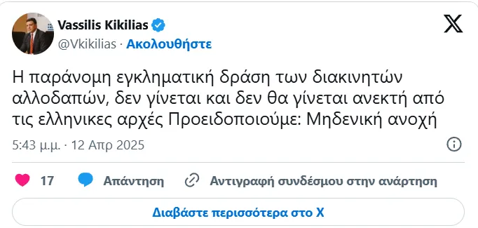 «Η παράνομη εγκληματική δράση των διακινητών αλλοδαπών δεν γίνεται και δεν θα γίνεται ανεκτή από τις ελληνικές αρχές. Προειδοποιούμε: Μηδενική ανοχή», σημείωσε χαρακτηριστικά.