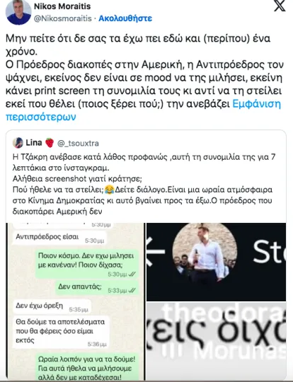 Όταν δε η Θεοδώρα Τζάκρη ζητά άμεση δια ζώσης συνάντηση από τον πρόεδρο (λέγοντας ότι δεν την καταδέχεται), ο Στέφανος Κασσελάκης της απαντά «Δεν είμαι σε mood τώρα».