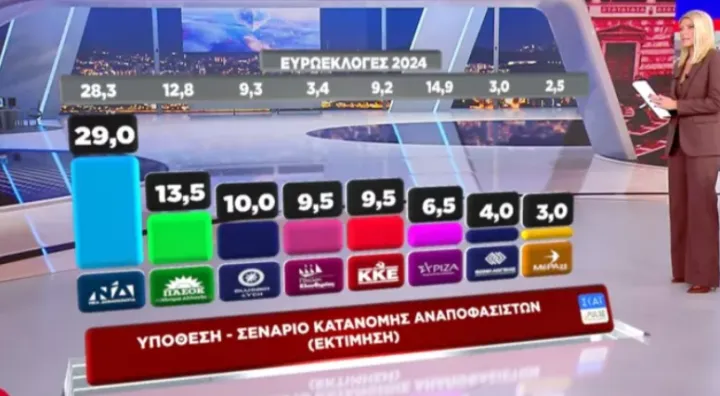 Συγκεκριμένα, στην εκτίμηση ψήφου, η Νέα Δημοκρατία λαμβάνει ποσοστό 29%, με δεύτερο το ΠΑΣΟΚ στο 13,5%.