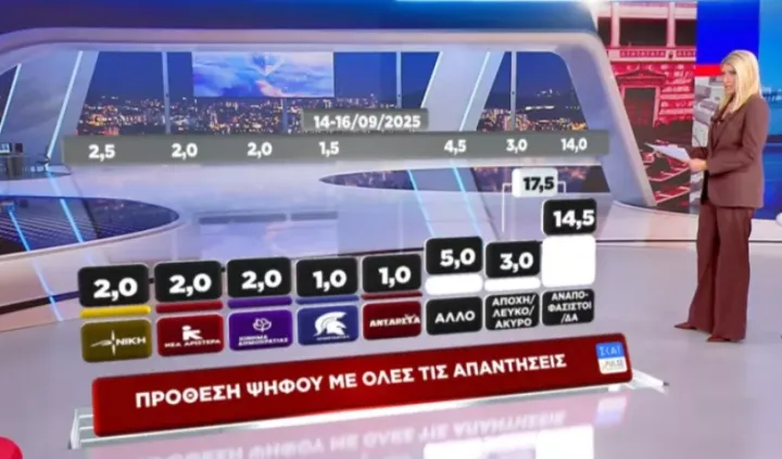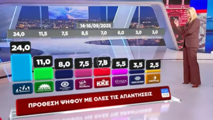 Ακολουθεί η Ελληνική Λύση και με 7,5% Πλεύση και ΚΚΕ. Στο 5,5% ακολουθεί ο ΣΥΡΙΖΑ.