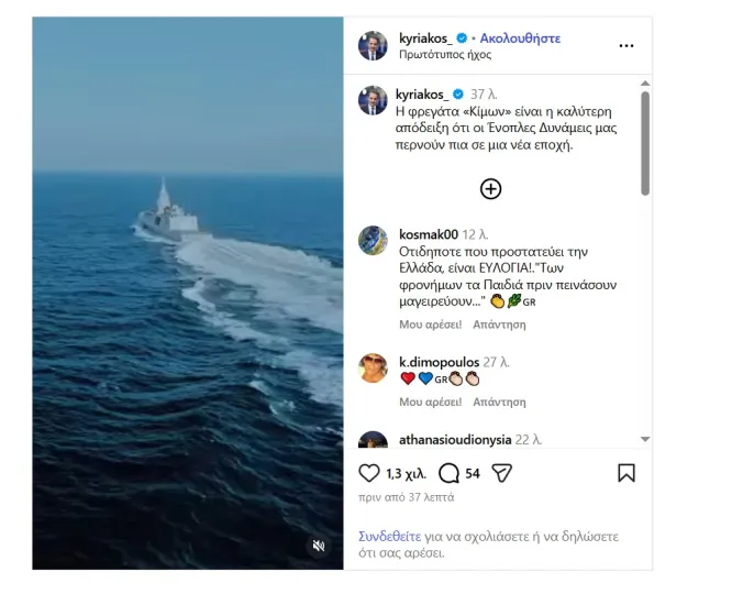 Ο πρωθυπουργός συνόδευσε την ανάρτησή του και με ένα βίντεο από την τελετή και την ύψωση της ελληνικής σημαίας στην F-601 «Κίμων», που πραγματοποιήθηκε νωρίτερα στα ναυπηγεία της Naval Group, στην πόλη Λοριάν της Γαλλίας.