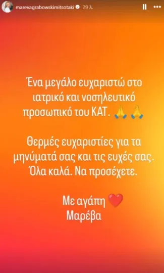Μέσω ενός Instagram Story, η Μαρέβα Μητσοτάκη ανέφερε τα εξής: «Ένα μεγάλο ευχαριστώ στο ιατρικό και νοσηλευτικό προσωπικό του ΚΑΤ. Θερμές ευχαριστίες για τα μηνύματά σας και τις ευχές σας. Όλα καλά. Να προσέχετε. Με αγάπη. Μαρέβα», έγραψε.