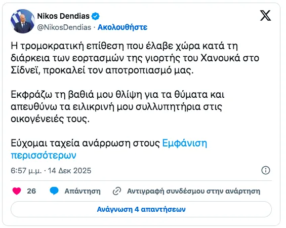 «Εκφράζω τη βαθιά μου θλίψη για τα θύματα και απευθύνω τα ειλικρινή μου συλλυπητήρια στις οικογένειές τους. Εύχομαι ταχεία ανάρρωση στους τραυματίες» υπογράμμισε ο κ. Δένδιας.