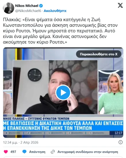 Μιλώντας την Πέμπτη στο Action24, ο κ. Πλακιάς είπε πως «είναι ψέματα όσα κατήγγειλε η Ζωή Κωνσταντοπούλου για άσκηση αστυνομικής βίας στον κύριο Ρούτσι. Ήμουν μπροστά στο περιστατικό. Αυτό είναι ένα μεγάλο ψέμα. Κανένας αστυνομικός δεν ακούμπησε τον κύριο Ρούτσι».