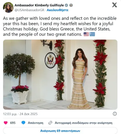 «Καθώς μαζευόμαστε με τους αγαπημένους μας και αναπολούμε την απίστευτη χρονιά που πέρασε, σας στέλνω τις εγκάρδιες ευχές μου για χαρούμενες γιορτές. Ο Θεός να ευλογεί την Ελλάδα, τις Ηνωμένες Πολιτείες και τους λαούς των δύο μεγάλων εθνών μας».