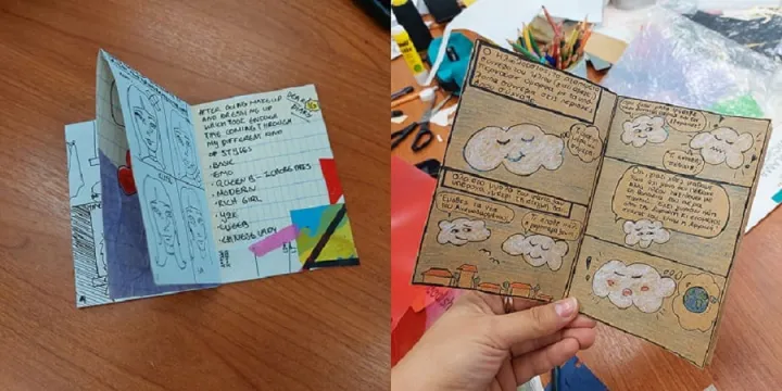 Θα πραγματοποιηθούν εργαστήρια κόμικς που απευθύνονται σε σχολικά τμήματα Δημοτικού και Γυμνασίου με τίτλους: «Σχεδιασμός χαρακτήρα κόμικ» και «Το δικό μουκόμικστριπ!». Διδάσκοντες των εργαστηρίων θα είναι οι Περικλής Κουλιφέτης (δημιουργόςκόμικς, εικαστικός, εκπαιδευτικός) και η Μαρία Τζαμπούρα (σκιτσογράφος καιεικονογράφος).