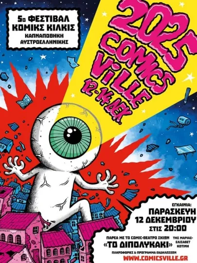 Τα εγκαίνια του 5ου Φεστιβάλ «COMICSVILLE» θα πραγματοποιηθούν την Παρασκευή 12Δεκεμβρίου 2025 στις 20.00 στην Καπναποθήκη της Αυστροελληνικής (Νικ. Παναγιώτου 50, Κιλκίς). Θα παρουσιαστεί η ενήλικη παράσταση θεάτρου σκιών «Το Διπολυκάκι» βασισμένη στο ομώνυμο δημοφιλές κόμικ της Μαρίας-Ελισάβετ Κοτίνη.