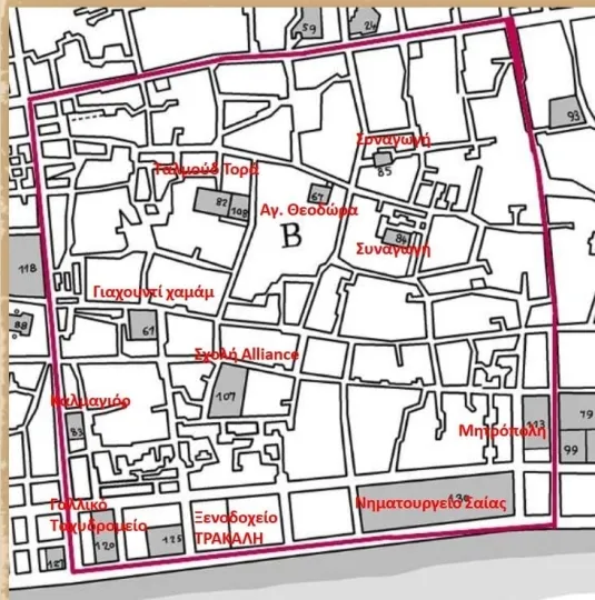 Αντίστοιχα, οι οθωμανικές πηγές αναφέρουν τα όρια της περιοχής ως Sabri Pasa – Kalamaria Caddesi – Aya Sofya Cami’i – Beyaz Kule, επιβεβαιώνοντας την ίδια κεντρική θέση της. Η χαρτογράφηση της πυρίκαυστης ζώνης τόσο στο υπόβαθρο του 1917 όσο και στο σημερινό υπόβαθρο δείχνει το μέγεθος της μεταβολής.