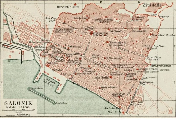 Στην περίοδο αυτή ανήκει και ο γερμανικός χάρτης «Reede von Saloniki» (1890–1891), παράρτημα ταξιδιωτικού οδηγού του εκδοτικού οίκου Dorn. Στην περιοχή μελέτης σημειώνονται η συναγωγή Ταλμούδ Τορά, η μονή Αγίας Θεοδώρας, το Μητροπολιτικό συγκρότημα, το Ελληνικό Γυμνάσιο και ο ναός του Αγίου Μηνά, τοποθετημένος ωστόσο σε εσφαλμένη θέση. Η Εγνατία αναφέρεται ως «Μεγάλη Οδός» (GrandeRue).