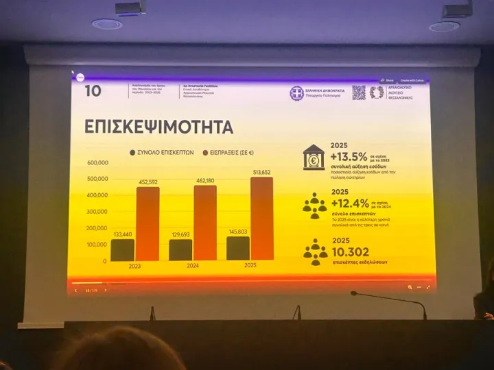 Τα στοιχεία που παρουσιάστηκαν από τη Γενική Διευθύντρια του ΑΜΘ δείχνουν αύξηση τόσο της επισκεψιμότητας όσο και των εσόδων. Το 2023 το Μουσείο υποδέχθηκε 133.440 επισκέπτες, το 2024 129.693, ενώ το 2025 οι επισκέπτες ανήλθαν σε 145.803, καταγράφοντας αύξηση 12,4% σε σχέση με το προηγούμενο έτος.