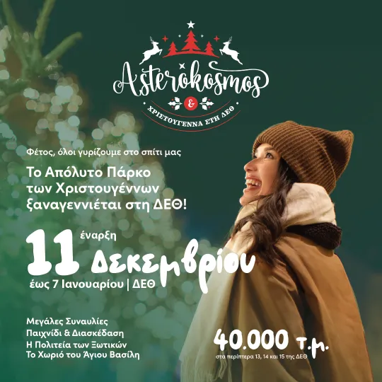 Σε έναν χώρο άνω των 40.000 τ.μ., με στεγασμένες και υπαίθριες εγκαταστάσεις στα περίπτερα 13, 14 και 15 της ΔΕΘ, ο Αστερόκοσμος φέτος μεταμορφώνεται στην πιο μαγική και παραμυθένια Χριστουγεννιάτικη Πολιτεία. Ατελείωτο παιχνίδι, δημιουργία και χαμόγελα, με άνεση και ασφάλεια ανεξάρτητα από τις καιρικές συνθήκες.