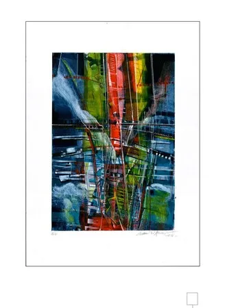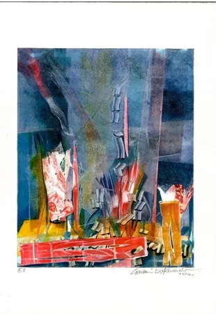 Οι μονοτυπίες ανήκουν στην πρόσφατη παραγωγή του Ιταλού καλλιτέχνη και συγκροτούν, όπωςεπισημαίνουν οι διοργανωτές, μια ενιαία εικαστική πορεία, με εσωτερική συνοχή και ισορροπία.Έντονες χρωματικές αντιθέσεις καιένα πλέγμα γραμμών που οργανώνει τον χώρο χωρίς να τον περιορίζει, θερμά και ψυχρά πεδία συνυπάρχουν στα έργα. Το αποτέλεσμα αποκαλύπτει μια ζωγραφική πράξη που ισορροπεί ανάμεσα στον αυθορμητισμό και στον έλεγχο, αναδεικνύοντας τη μονοτυπία ως πεδίο πειραματισμού και ακρίβειας ταυτόχρονα.