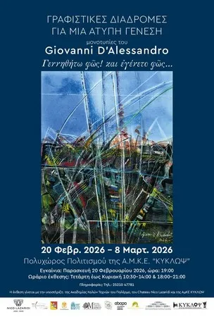 Η έκθεση «Γραφιστικές Διαδρομές για μία Άτυπη Γένεση» εγκαινιάζεται την Παρασκευή 20 Φεβρουαρίου 2026 στον Πολυχώρο Πολιτισμού της ΑμΚΕ «ΚΥΚΛΩΨ» (Καπναποθήκη Αναστασιάδη), στο Πάρκο Αγίας Βαρβάρας και παρουσιάζει τριάντα μονοτυπίες του Ιταλού καλλιτέχνη Giovanni D’ Alessandro.