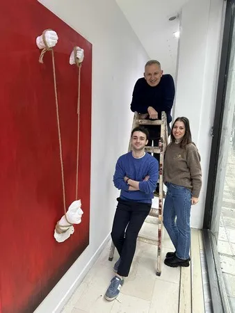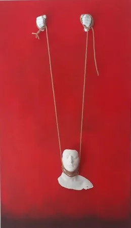 Στη συγκεκριμένη έκθεση, το θέμα του έρωτα τον οδήγησε στη γλυπτική. Τα τρία γλυπτά που εκτίθενται στις βιτρίνες του ΟΤΕ – μέρος μιας συλλογής εννέα έργων – αποτυπώνουν επώδυνες πτυχές αυτού του συναισθήματος. «Αρχικά προσπάθησα να μιλήσω ζωγραφικά για το επώδυνο κομμάτι του έρωτα. Όμως δεν μου αρκούσε, δεν ήταν οπτικά αυτό που είχα στο μυαλό μου. Ήθελα να δείξω την πίεση που μπορεί να προκληθεί από το πάθος ανάμεσα σε δύο ανθρώπους. Έτσι μπήκαν τα χέρια, τα σχοινιά, τα κεφάλια που δυσκολεύονται να αναπνεύσουν». Τα υλικά που χρησιμοποιεί στη συγκεκριμένη ενότητα έργων – κυρίως γύψος και σχοινιά – προσφέρονται για την τρισδιάστατη απεικόνιση της έντασης που θέλει να μεταφέρει. Ένα από τα έργα, η καρδιά που σφίγγεται από δύο χέρια, ήταν επιλογή επηρεασμένη από τον Damien Hirst — «μία επώδυνη διαδικασία αλλά οπτικά βγήκε το αποτέλεσμα», όπως λέει.