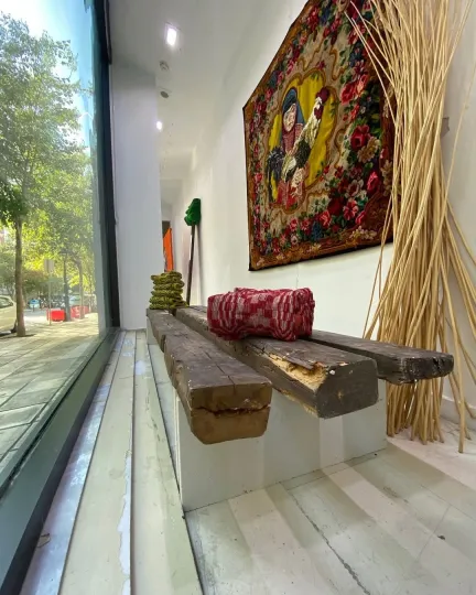 Στα χέρια του καλλιτέχνη υφάσματα, ρετάλια, παλιά υφαντά και ταπετσαρίες επίπλων, παίρνουν νέα ζωή για να γίνουν έργα τέχνης. Κάθε κομμάτι ύφασμα κουβαλά τη δική του ιστορία, ένα άγγιγμα, μια ανάμνηση, που ο καλλιτέχνης μετασχηματίζει σε νέο νόημα μέσα στη σύνθεση.