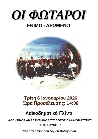 Το δρώμενο, που διοργανώνει ο Αθλητικός Αναπτυξιακός Σύλλογος Παλαιοκάστρου «Ο ΚΕΡΑΥΝΟΣ», υπό την αιγίδα του Δήμου Πολυγύρου, θα λάβει χώρα την Τρίτη 6 Ιανουαρίου 2026 και ώρα 14:00, στον προαύλιο χώρο της εκκλησίας του Αγίου Αθανασίου, στο Παλαιόκαστρο Χαλκιδικής.