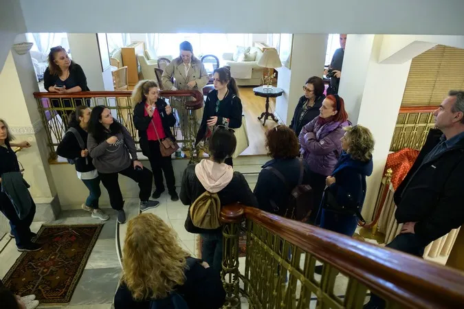 Ομάδα ατόμων στη διάρκεια ξενάγησης της ΤWT μέσα στο μεσοπολεμικό ξενοδοχείο MINEΡΒΑ που λειτουργεί μέχρι σήμερα