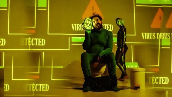 Δημιούργημα του σκηνοθέτη Θανάση Μεγαλόπουλου και των ηθοποιών-συγγραφέων Κωνσταντίνου Μαυρόπουλου και Κωνσταντίνου Δαλαμάγκα, η παράσταση «Η ανθρώπινη μ@λ@κία που με εξουθενώνει» χρησιμοποιεί τον παραλογισμό και τον καταιγιστικό ρυθμό της κωμωδίας για να αποδομήσει τα τοξικά πρότυπα της ψηφιακής εποχής, με έναν καθρέφτη στραμμένο στο κοινό.