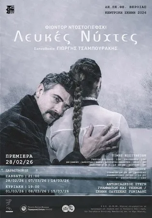 Η παράσταση «Λευκές Νύχτες» του Φιοντόρ Ντοστογιέφσκι, σε σκηνοθεσία και ερμηνεία Γιώργη Τσαμπουράκη, κάνει πρεμιέρα στις 28 Φεβρουαρίου 2026, στην Αντωνιάδειο Στέγη Γραμμάτων και Τεχνών της Βέροιας φέρνοντας στη σκηνή μια ρομαντική νουβέλα που γράφτηκε το 19ο αιώνα αλλά μιλάει για τα σημερινά διλήμματα.