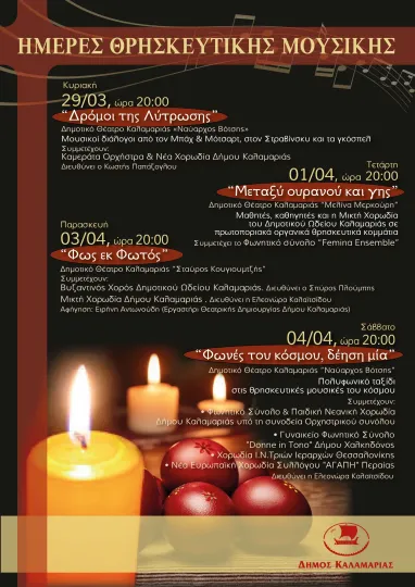 Κυριακή 29 Μαρτίου 2026 | 20:00 «Δρόμοι της Λύτρωσης» Δημοτικό Θέατρο Καλαμαριάς «Ναύαρχος Βότσης» Μουσικοί διάλογοι από τον Μπαχ και τον Μότσαρτ έως τον Στραβίνσκυ και τα γκόσπελ Συμμετέχουν: Καμεράτα Ορχήστρα & Νέα Χορωδία Δήμου Καλαμαριάς Διεύθυνση: Κωστής Παπάζογλου