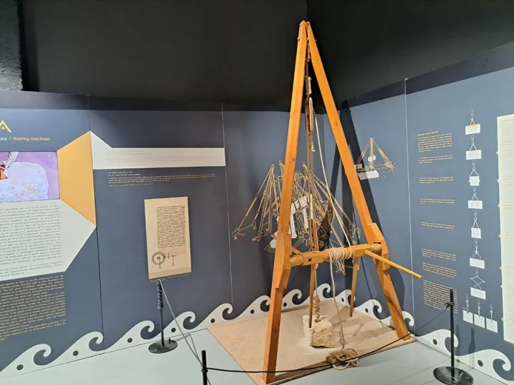Η περιήγηση ξεκινάει από τη δίκωλο ανυψωτική μηχανή του Ήρωνος ( 6ο αι. π.Χ.), τον πρώτο γερανό κατακόρυφης ανύψωσης παγκοσμίως, με τον οποίο κατασκευάστηκαν κάποια από τα πιο εμβληματικά μνημεία της αρχαιότητας, όπως οι Θολωτοί Τάφοι των Μυκηνών.