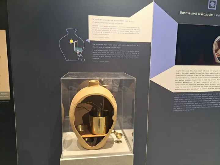 Μεταξύ των εμβληματικών εκθεμάτων ξεχωρίζουν: η αυτόματη θεραπαινίδα του Φίλωνος (3ος αι. π.Χ.), το πρώτο «ρομπότ» της ανθρωπότητας, ένα ανθρωποειδές ρομπότ με τη μορφή υπηρέτριας (σε φυσικό μέγεθος) που στο δεξί χέρι της κρατούσε μια οινοχόη. Όταν ο επισκέπτης τοποθετούσε έναν κρατήρα (κύπελλο) στην παλάμη του αριστερού χεριού της εκείνη αυτόματα έριχνε αρχικά οίνο και στη συνέχεια για ανάμειξη νερό στον κρατήρα ανάλογα με την επιθυμία του.