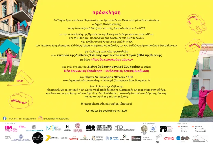 - Κύρια έκθεση “Πώς θα κατοικούμε αύριο;” – Νέα Κοινωνική Κατοίκηση στη Βιέννη @ ΔΗΜΑΡΧΕΙΟ ΘΕΣΣΑΛΟΝΙΚΗΣ (λεωφ. Βασ.Γεωργίου 1) _14-24 ΟΚΤΩΒΡΙΟΥ 2025 – Εγκαίνια 16 Οκτ. 18.00 (Η έκθεση θα μεταφερθεί @ ΠΟΛΥΤΕΧΝΙΚΗ ΣΧΟΛΗ ΑΠΘ 30 ΟΚΤΩΒΡΙΟΥ – 7 ΝΟΕΜΒΡΙΟΥ 2025)