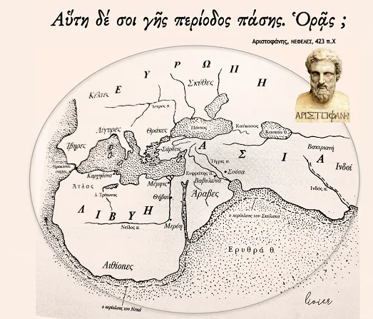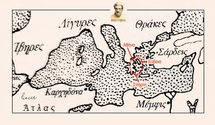 Μέσα στο Φροντιστήριον, ο μαθητής, ο παππούς, δηλαδή ο Στρεψιάδης, ρωτάει διάφορα για να μάθει. Υπάρχει εκεί μια σκηνή με έναν χάρτη – είναι ένας παγκόσμιος χάρτης κολλημένος στον τοίχο. Αυτή είναι η πρώτη πεντακάθαρη, σαφέστατη απόδειξη ότι οι αρχαίοι Έλληνες χρησιμοποιούσαν χάρτες. Ο Λιβιεράτος μου λέει: «Μπορώ να σ’ το αποδείξω». Και το έκανε. Υπάρχουν εκεί μέσα εργαλεία, έννοιες και αναφορές σε γεωγραφικές περιοχές –η Εύβοια, η Σπάρτη– και σε ουράνια σώματα. Την αστρονομία δεν τη μελετούσαν τότε με την έννοια της επιστήμης που έχουμε στο μυαλό μας σήμερα, αλλά ως εργαλείο για την πλοήγηση.