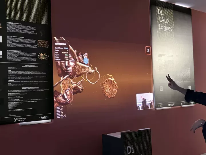 Αυτές οι δυνατότητες ξεδιπλώνονται στο Αρχαιολογικό Μουσείο Θεσσαλονίκης, στον χώρο της μόνιμης έκθεσης «Ο χρυσός των Μακεδόνων», όπου φιλοξενείται η περιοδική έκθεση «Dilogues». Πρόκειται για μια συνεργασία της Σχολής Καλών Τεχνών του Πανεπιστημίου Ιωαννίνων και του Τμήματος Εικαστικών Τεχνών και Επιστημών της Τέχνης με το μουσείο, στο πλαίσιο του ερευνητικού έργου «Αλγοριθμική ανάγνωση της αρχαιότητας: Ψηφιακή οπτικοποίηση με έμπνευση από το Αρχαιολογικό Μουσείο Θεσσαλονίκης».