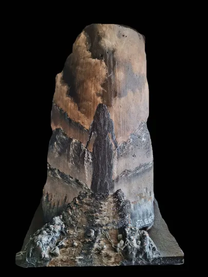 Το δεύτερό μου έργο τα Πέτρινα Σύνορα – όπως προαναφέρω- είναι εμπνευσμένο από το βιβλίο μου με τίτλο «ΣΚΟΤΕΙΝΗ ΧΙΜΑΙΡΑ» το οποίο επίσης παραθέτω στην παρούσα έκθεση, μιας και συνάδει απόλυτα με τη θεματική της. Η τοποθέτηση του βιβλίου αποτελεί πρωτοβουλία της διοργανώτριας της έκθεσης και ιδιοκτήτριας του χώρου Νατάσας Γκοβεδάρου, διότι στις σελίδες του πέραν του αστυνομικού-παραφυσικού χαρακτήρα του, αποτυπώνεται και η αιχμαλωσία-ομηρία μιας γυναικείας ύπαρξης στα μπουντρούμια ενός σπιτιού, από την ίδια της την οικογένεια, κάτω από άθλιες συνθήκες διαβίωσης που δεν συνάδουν με την ανθρώπινη ύπαρξη και ζωή, εξαιτίας των ιδιαίτερων ψυχικών δυσλειτουργιών της.