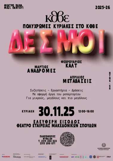 Στις 30 Νοεμβρίου θα πραγματοποιηθεί η πρώτη Πολύχρωμη Κυριακή του ΚΘΒΕ, με τίτλο «ΔΕΣΜΟΙ», που θα εστιάσει στους έρωτες, τις μακροχρόνιες σχέσεις και τον χωρισμό, με αφορμή τις παραγωγές της πρώτης σεζόν του ΚΘΒΕ (Το τέλος του έρωτα του Pascal Rambert, Η Ξανθιά φράουλα του Mino Bellei και Οι Γείτονες από Πάνω του Cesc Gay).